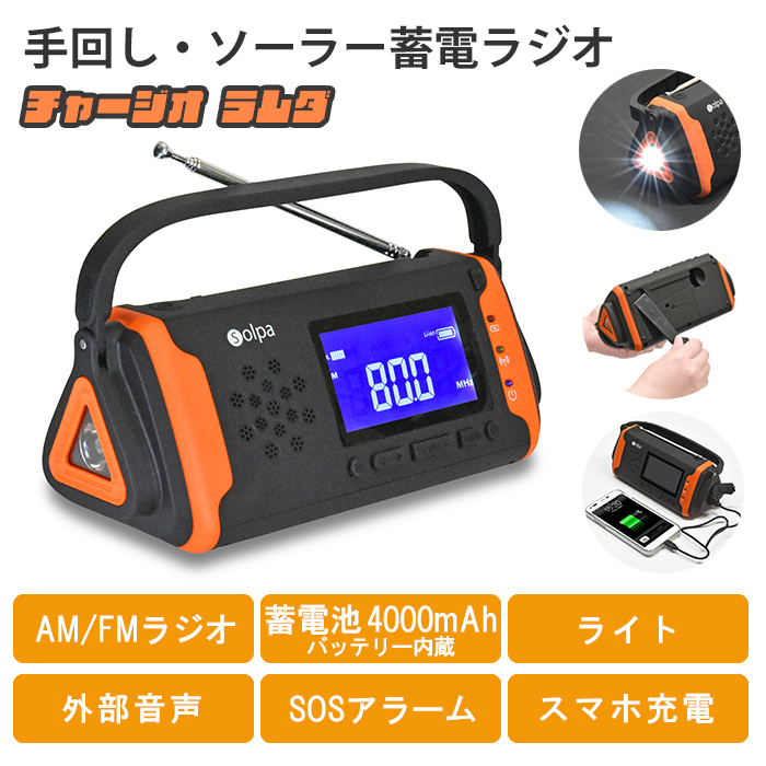 手回し・ソーラー・USBの3WAY充電、スマホ充電も可能な「もしも」に頼れる1台です。■ 同シリーズ ■● 手廻し/ソーラー蓄電ラジオ チャージオmini● 手回し・ソーラー蓄電ラジオ チャージオラムダ※このページは[手回し・ソーラー蓄電ラジオ チャージオラムダ]を販売しております。キーワード: 蓄電ラジオ 手回し充電 手廻し ソーラー充電 USB充電 3電源 ラジオ AM FM ライト 蓄電池 4000m Ah バッテリー内蔵 外部音声 SOSアラーム スマホ充電 USBケーブル付き チャージオラムダ 緊急 非常時 避難 災害 震災 水害 停電 夜間 万が一の備え 屋外 レジャー キャンプ アウトドア 手回し・ソーラー蓄電ラジオ チャージオラムダ
