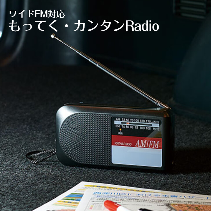 ● 商品名:もってく・カンタンRadio ラジオ ● 包装サイズ:40×150×95mm ● 重量:173g ● 商品サイズ:143×30×75mm ● 材質:ABS樹脂 ● 内容:本体/単三乾電池2本使用(別売)、付属品/イヤホン(両耳タイプ)