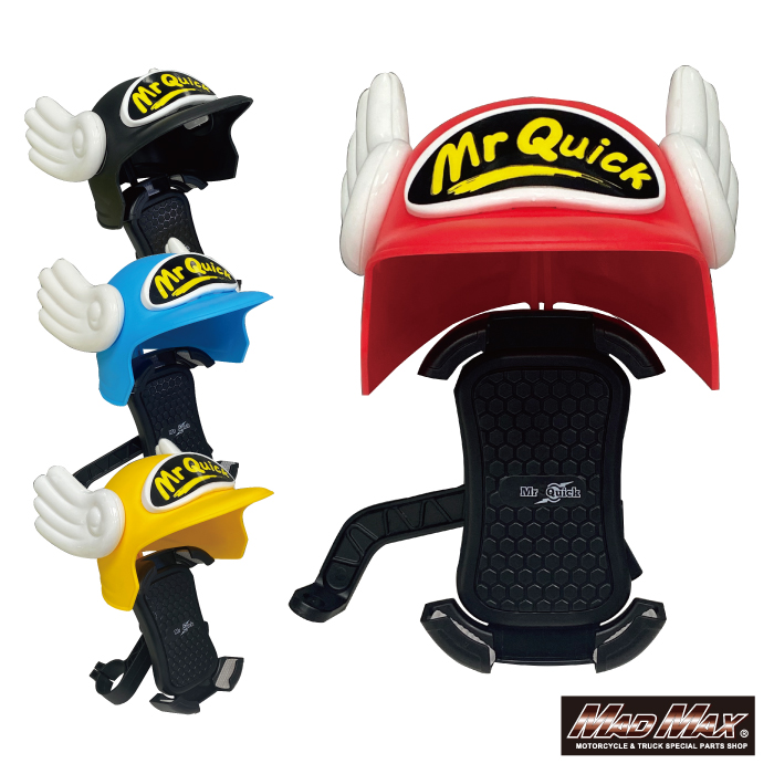 Mr Quick製 バイク用スマートフォンホルダー バイザー付き。サンシェード付きでスマートフォン画面への反射を抑え、視認性を高めます。スマートフォンをホルダーにセットしてサイドボタンを押せばホルダーがロックされます。※走行中は必ずホルダーをロックして下さい。ハンドルクランプステーとミラーステーの2種類のステーが付属しています。対応スマートフォンサイズ縦約:130〜170mm、横約60mm〜75mm迄対応可能付属品:本体1個、ハンドルクランプステー1個、ミラーステー1個 ※定期的にクランプネジの増し締めを行って下さい。走行中の振動で緩む場合が御座います。走行中は大変危険ですので絶対にスマートフォン又はナビゲーションの操作は行わないで下さい。スマートフォンをホルダーから取外す際にホルダーが勢いよく閉じる場合が御座います。手等を挟まないようにお気をつけ下さい。