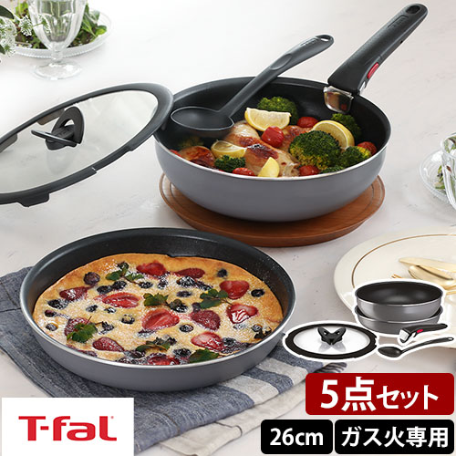 フライパン ウォックパン セット 食洗機対応 5点 取っ手が取れる 外せる 着脱ハンドル 深型 26cm 蓋付き チタン くっつかない 手入れしやすい ガス火 オーブン 軽い おしゃれ ティファール インジニオ・ネオ フレーズグレー ベーシック セット5 T-FAL ingenio-neo L16190