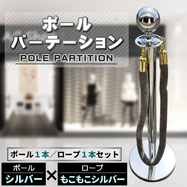 ■ポールパーテーション 1本 セット シルバーポール シルバーロープ もこもこ ガイドポール ポール スタンド パーテーション 通路 仕切り