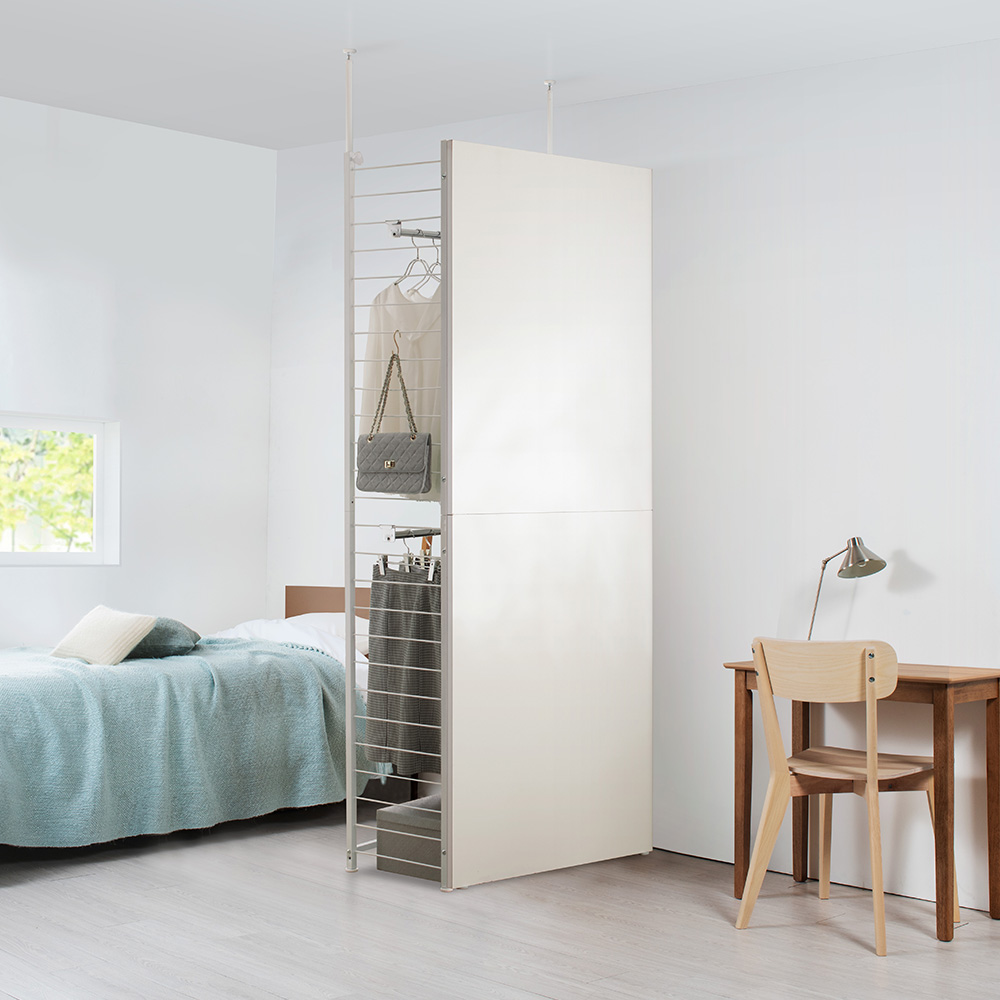 工事不要。天井までの高さを生かす突っ張り式の間仕切り収納です。清潔感あるホワイトカラー。圧迫感のないオープンタイプなので、コンパクトな空間にもおすすめ。衣類や雑貨を収納しながら、限られた空間を機能的に活用できます。