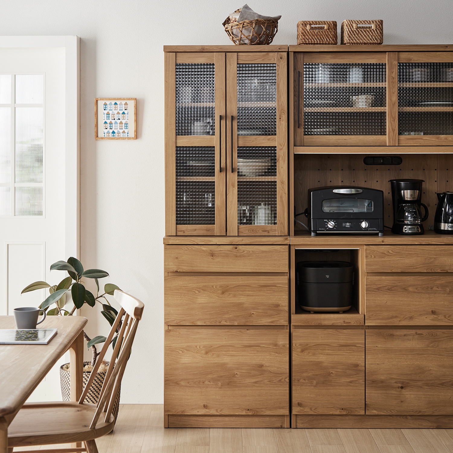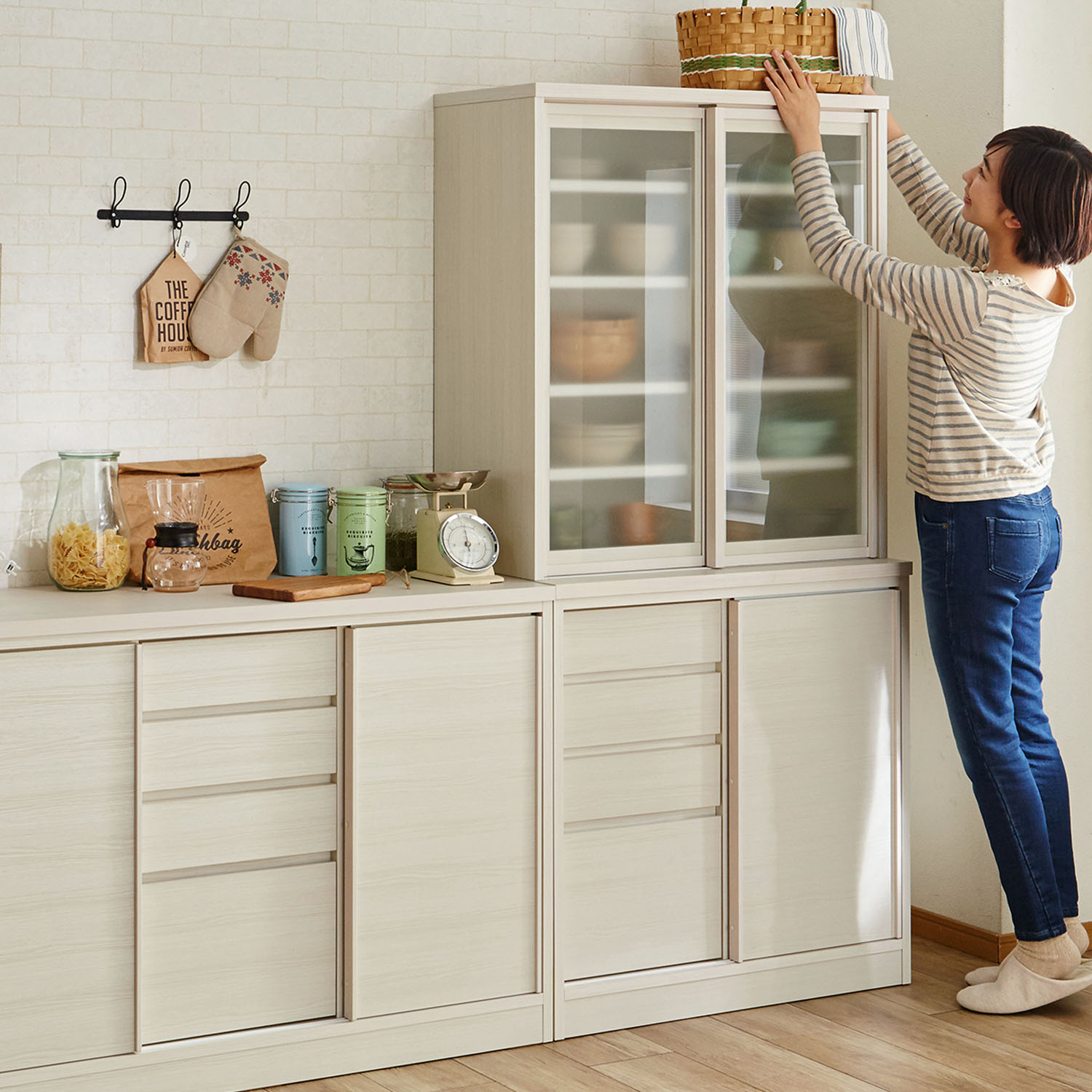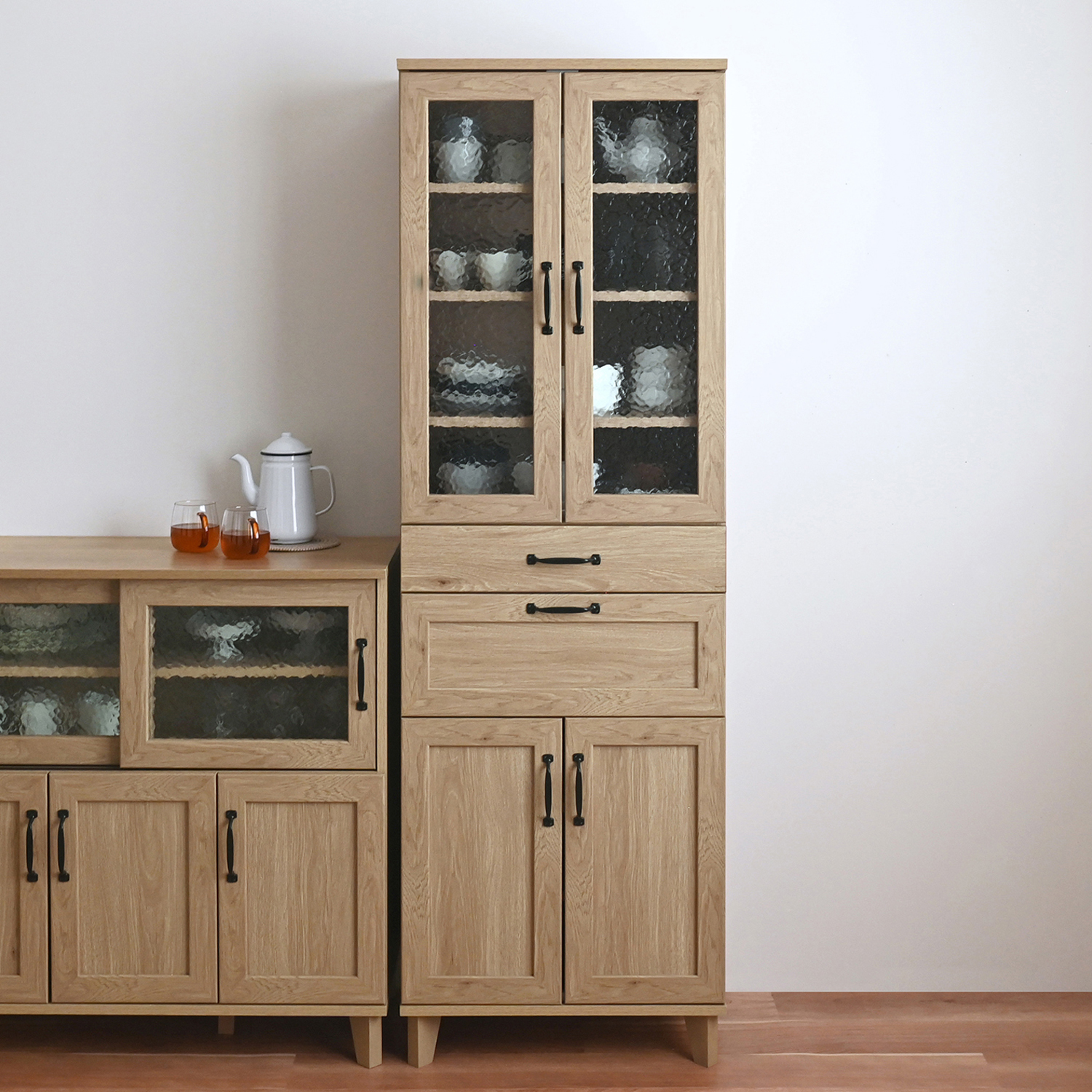 お部屋にあたたかみを添える木目調デザインの食器棚高さを抑えているので天板に物を置くことができ、女性でも手が届きやすくなっています上下段ともに、狭いキッチンでも開け閉めしやすい引き戸を採用ホワイトの食器収納部の引き戸にはくもりガラスを付け、ほんのりと目隠ししながらしまうことができますナチュラルは透明なガラスで、スッキリとした表情下段の引き戸には、開け閉めの衝撃を和らげるクッションを付け、キズが付きにくいよう配慮下段サイドには引出しが4杯、反対側には可動棚を備え、食器からカトラリー類まで仕分けながらすっきりと収納可能です引き戸取っ手にアルダー材を使用した、さりげない木の風合いを楽しめるのもつくりの良さを感じさせるポイントシリーズのキッチンカウンターと揃えて置けば、デザイン、使い勝手ともにgoodなキッチンに