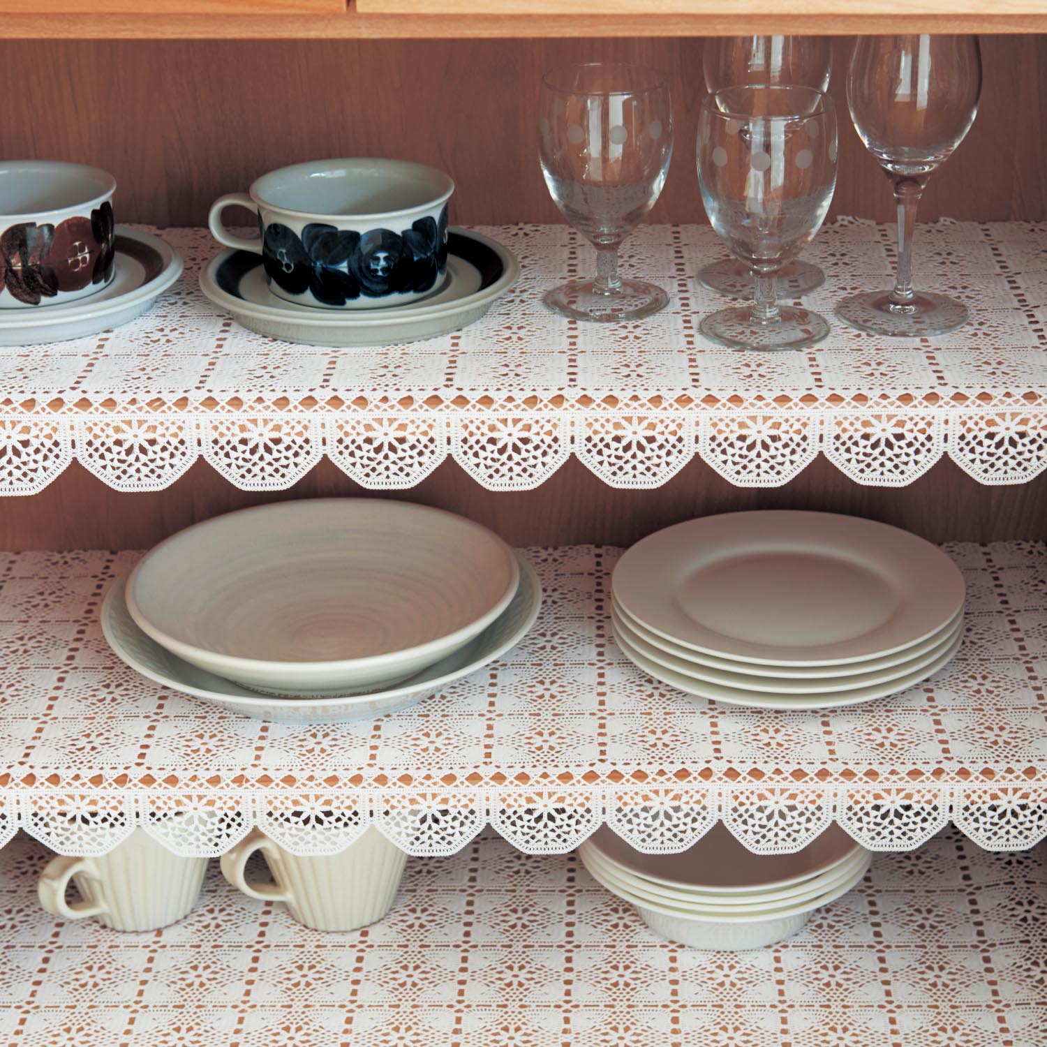 EVA樹脂素材の食器棚シート、2枚組レース調の柄が使いやすく、端のスカラップ部分を棚板からたらして使うことができてインテリアのアクセントにも食器棚だけでなく、玄関やキッチンのカウンターにも使えますハサミ等で自由にカットできます。※汚れたらふきんなどで拭きとってください。