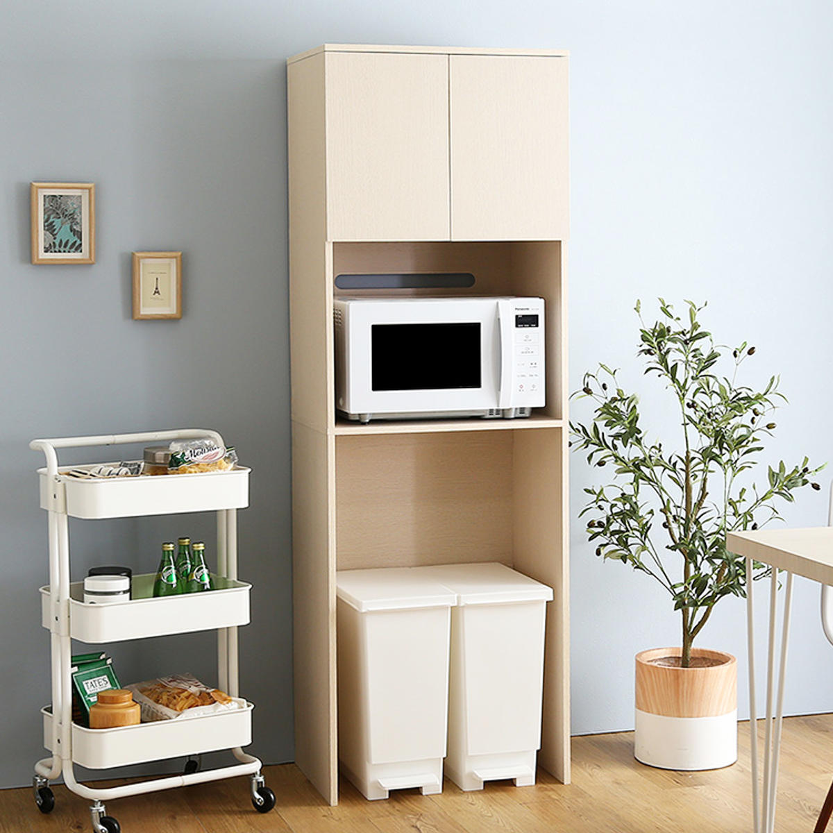 キッチンキャビネット 食器や調理家電、食品ストックまでまとめて収納でき、キッチン作業を効率化。隙間に置きやすい幅60cm 生産地 マレーシア製 サイズ (約)幅60×奥行42(取手含む)×高さ174cm 素材 主材:プリント紙化粧パーティクルボード ■組立式 ■2口コンセント付