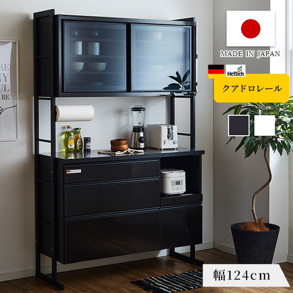 ■キッチンボード 食器棚 幅124cm スライドボード 引出し収納 クアドロレール仕様 可動棚 Moiss ガラス扉 ステンレス天板 キッチン 日本製