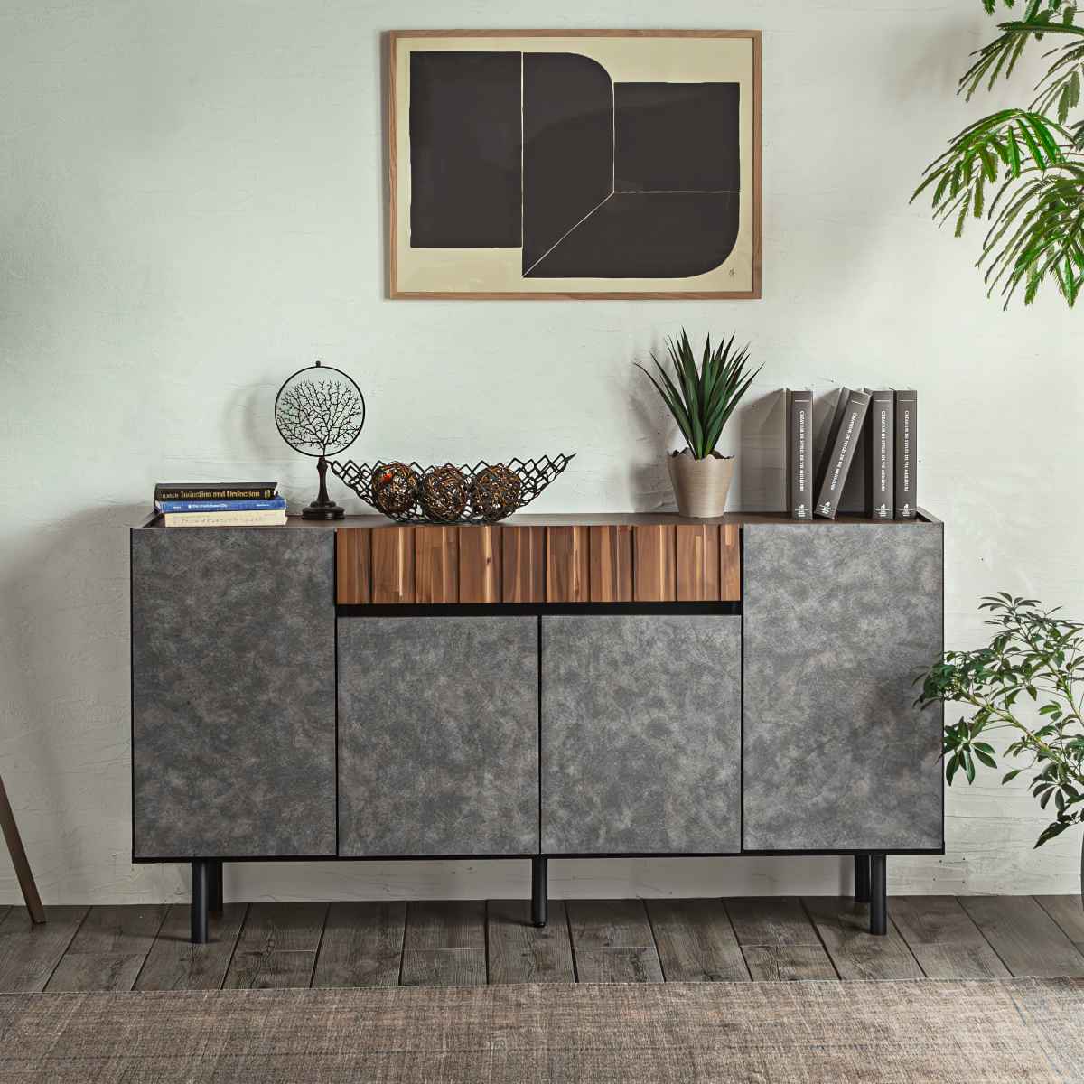■サイドボード コンクリート調 アカシア材 モダンデザイン 幅150cm ( リビングボード 棚 ラック 収納 家具 日本製 完成品 食器棚 飾り棚