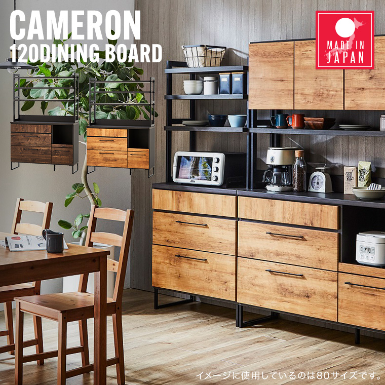 ※北海道、東北、沖縄、離島につきましては別途送料がかかります。ご注文後メールにて金額をお知らせ致します。■サイズ[ 外寸 ]全体:幅120×奥行42×高さ180cm[ 内寸 ]カウンター部:幅114×奥行39.7cm(高さは棚板の高さによる)カウンター部3枚棚板付き(3.3cmピッチ高さ調整可能)左上引出:幅70×奥行33.5×高さ7.5cm(有効高9.5cm)左中引出:幅70×奥行33.5×高さ13.5cm(有効高19.5cm)左下引出:幅70×奥行33.5×高さ13.5cm(有効高25.8cm)右下引出:幅31.1×奥行33.5×高さ13.5cm(有効高25.8cm)スライド棚:幅36.3×奥行38.7×高さ35.8cm■材質本体:スチール前板:MDF / 強化紙■詳細日本製組立品・味わい深いヴィンテージ仕上げの木目調シートに天板とスチール脚のブラックを合わせたメリハリの効いたデザインの食器棚。※撮影及び表示画面の関係で、実際の色と異なって見える場合がございます。