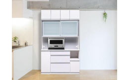 ・引き出し1段目は仕切りトレーが付属しております。・引き出しの2段目は食器の仕分けに便利なステンレス収納引き出しを採用しました。・引き戸は開け閉めがなめらかなデュアルソフトクローズレールを使用しております。・オープンスペースには2口コンセントが左右に付属しております。・オープン部天井には防湿・防臭・有害物質を軽減してくれるモイスを使用しております。・天板は熱や汚れに強く耐久性に優れたメラミンを使用。サッと拭くだけできれいになります。・開き扉はゆっくりと静かに閉まるソフトクローズ蝶番を使用し、閉まる際の不快な音を解消。閉まる時に衝撃を和らげ本体への負担も軽減してくれます。・天板はホワイトにはホワイト色のメラミンを使用しております。・オープン部背面には熱や蒸気、腐食に強く耐久性に優
