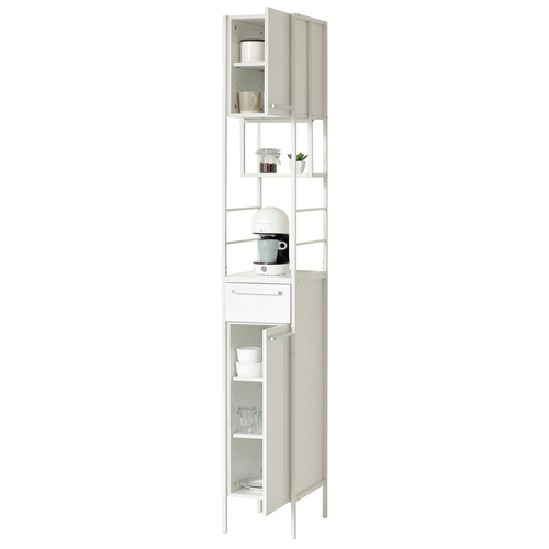 [サイズ][外寸]幅59.5×奥行40.5×高さ160cm[内寸](上部扉内)幅51.5×奥行35.5×高さ35cm(下部扉内)幅51.5×奥行35.5×高さ35.5cm(オープン部)幅56×奥行37.5×高さ40.5cm(スライド部)幅53.5×奥行35×高さ31.5cm(スライド引き幅)26cm(可動棚)幅56×奥行35×厚み1.5cm(3.2cmピッチ3穴)収納量・耐荷重[可動棚/スライド棚]約5kg以下[天板]約7kg以下梱包サイズ(cm)幅(横)×奥行(縦)×高さ:?86.5×43.5×18?85×43×11.5梱包重量(?) :?24?16[素材][本体]プリント紙化粧合板[オープン部]合成樹脂化粧合板(塩化ビニル樹脂)[スライド部]合成樹脂化粧パーティクルボード(塩化ビニル樹脂)[カラー]ホワイト(WH)[生産国]マレーシア[商品説明]余計なものを排除した、シンプルなキッチンシリーズ「SIM」。キッチン家電も食器も一気に収納できるレンジ台シンプルなSIMシリーズのレンジ台。キッチン家電も食器も一気に収納。上部ガラス扉内にオシャレな食器を収納すれば、見せる収納が出来ます。・