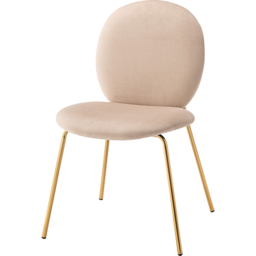●ベロア調の生地×アンティークゴールド脚の組合せが、ガーリーでトレンド感のある雰囲気を演出。 ●丸いフォルムがその可愛らしさを更に高め、お部屋を華やかに彩ってくれるデザイン。 ●背面のデザインにもこだわり、360度どこから見ても美しい仕上がり。 ●背面も座面も弾力があり、クッション性のある作りになっているので、座り心地も抜群。 ●生地はベロア調の物を採用。 ●程よく光沢感があり様々な表情を見せ、高級感を演出。 ●アンティークゴールドを施した細身の脚がアクセントになり、チェアのデザイン性を引き上げています。 カラー:ベージュサイズ:W49×D53×H76×SH43スペック:ポリエステル スチール(メッキ加工 アンティークゴールド色)原産地:中国