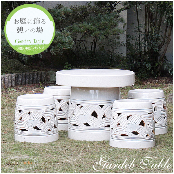 ■ガーデンテーブルセット 陶器 【送料無料】 14号ガーデンテーブル 物 お庭、ベランダ用庭園セット 信楽焼 おしゃれ 和風【手作り】
