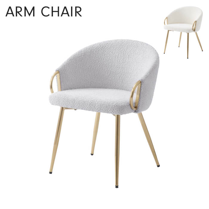 艶のあるゴールド脚×背面まで覆ったもこもこのブークレ生地の組み合わせが上品はアームチェア。背もたれと座面の生地には、もこもことした独特の質感が特徴のブークレ素材を使用。柔らかな印象だけでなく、エレガントな雰囲気も与えるトレンド生地です。キーワード: チェア 椅子 ダイニングチェア 1人掛け 幅54 スチール脚 布地 座面 取っ手 おしゃれ 背もたれ シンプル 可愛い ゴールド アームチェア リビングチェア 食卓椅子 イス チェアー パーソナルチェア 椅子のみ スチール脚 ファブリック コンパクト 上品 高級感 組立式 ダイニング リビング 書斎