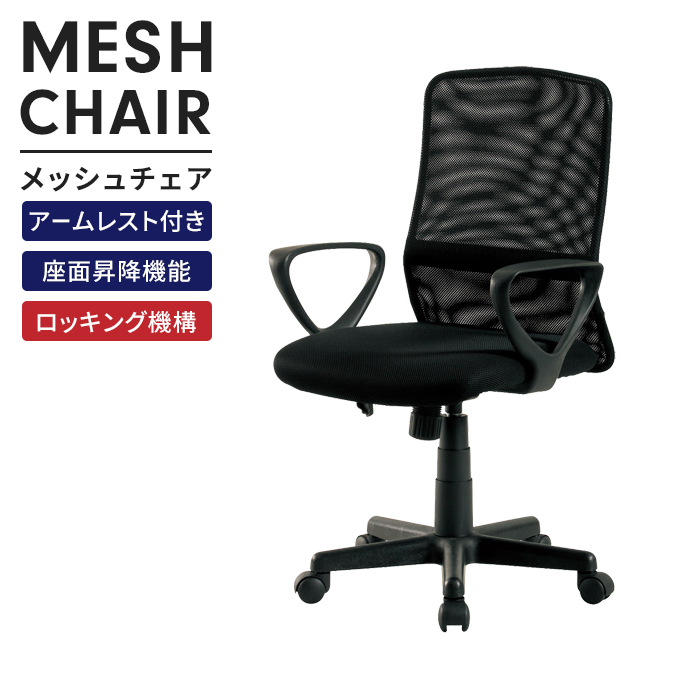 背や座に通気性の良いメッシュ素材を使用したオフィスチェア。長時間座っても快適な座り心地を提供します。キーワード: オフィスチェア デスクチェア メッシュ 1人掛け 肘掛け付き キャスター付き 回転 ローバック ロッキング 椅子 チェア シンプル メッシュチェア パソコンチェア PCチェア 事務椅子 回転チェア ワークチェア 座昇降 ガスシリンダー付き ロッキング機構 座りやすい 疲れにくい リビング 書斎 オフィス 自宅勤務 在宅勤務 在宅ワーク テレワーク 黒 ブラック