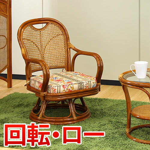 ■籐 回転座椅子 ロータイプ ラタンチェア 座面高13cm ( 回転式 背もたれ付き 肘付き 肘掛 イス チェア 座いす アジアン 籐家具 花柄 和モ