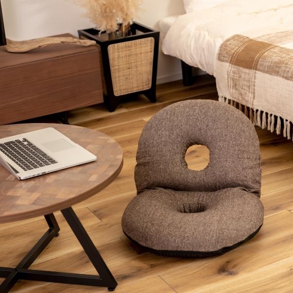 ●ふだん使いにちょうどいい、ドーナツ型のかわいいフロアチェア。●座面や背もたれは、ドーナツのように中央に穴が開いたデザイン。●座った時の圧迫感を緩和し、お尻にかかる負担をやわらげてくれるので長時間の使用に適したフロアチェア。●座面には低反発ウレタンを使用しているので、しっとりと柔らかくフィットした座り心地。●また座面はほど良い高さなので、ごろ寝枕としても使えます。●簡単に折りたたむ事ができ、軽量タイプなので持ち運びラクラクで収納も場所を取りません。【商品サイズ】幅48×奥行56×高さ37cm座面までの高さ:12cm【材質】ポリエステル【原産地】中国