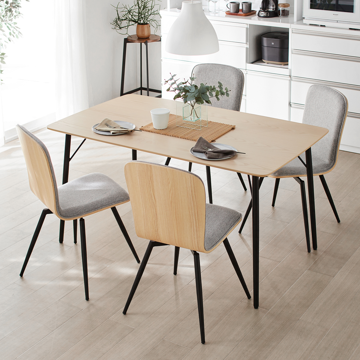 カジュアルモダンなダイニングを演出できるダイニングテーブル天然木の突板とスチールのスッキリした細い脚がマッチし、スタイリッシュな佇まいに仕上げています天板はウレタン樹脂塗装でお手入れもしやすいシリーズのダイニングチェアと揃えて、統一感のある空間を演出するのもオススメです