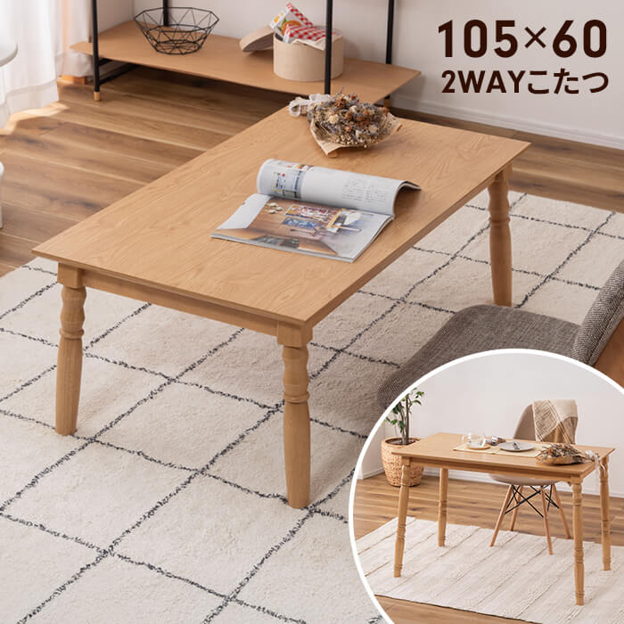 シーンに合わせて高さを変えられる2WAY仕様のこたつテーブル。座椅子やソファに合わせやすいロースタイルは床でゆったりくつろぐ定番のこたつスタイル。チェアと合わせて使うハイスタイルはデスクやダイニングテーブルとしてもお使いいただけます。カントリーデザインの代名詞ともいえる「ろくろ脚」を採用し、ユニークで華やかな印象のこたつ脚に仕上がっています。脚はくり脚デザインのこだわり仕様で継ぎ目が分かりにくいのもポイント。天板と脚の接続が強く、強度の高いやぐら型構造。天板裏には天板固定ネジが付いているので、こたつ布団を使わない時は天板をしっかり固定。木のぬくもりが感じられる美しい木目調デザインの天板。オフシーズンはコードの収納も可能なスペース有り。キーワード: こたつ コタツ 2WAY やぐら型 デスク ダイニングテーブル テーブル 天然木 木 天板固定 幅105cm 奥行60cm