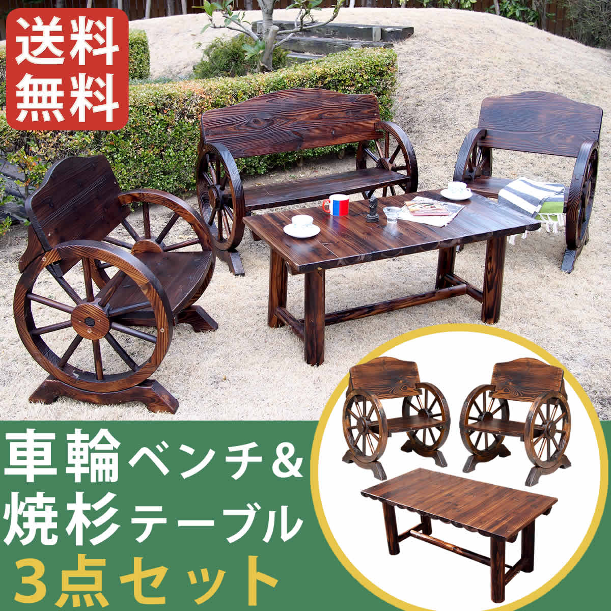 ■商品説明 モダンで懐かしさのある焼杉が目を惹く存在感たっぷりのガーデンセット 人気のヴィンテージ風車輪ベンチと、おそろいの焼杉テーブルの3点セットができました。 表面を焼き付けて浮き上がらせた、素朴でダイナミックな杉材の木目は月日が経つごとに、世界にひとつだけの味のある表情を見せてくれます。 室内でインテリアとして使っても素敵です!最近のセレクトショップでは、モダンインテリアに、こういう民芸風デザインを合わせているのをよく見かけますね。 お庭やウッドデッキの他、古民家カフェ、レトロな観光地、温泉街、城下町、動物園、神社仏閣、下町の喫茶店、港の遊歩道etc.ちょっとくつろぎたい空間で、どこか懐かしい車輪ベンチ&焼杉テーブルが、心を温めてくれそうです。 焼杉天然木でしか出せない、独創的でありながら品が良く、粋で風格のあるたたずまいをお楽しみください。 送料無料/簡単組立/天然木/木製/ガーデンテーブル/丸太/車輪ベンチシリーズ/庭/公園/什器/車輪/ログ/カントリー/焼杉/古木調/テーブル/チェア/ベンチ/縁台/和風/モダン