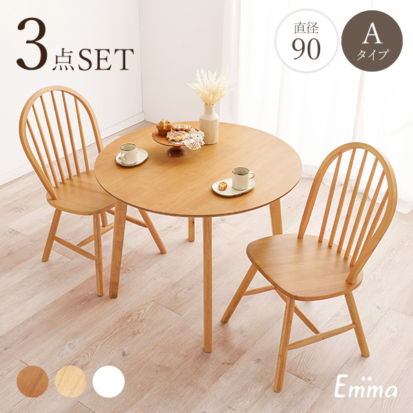 木製の温かみとおしゃれなデザインのダイニングシリーズ「エマ」。丸みのある可愛らしいフォルムのダイニングテーブルと、イギリスで生まれた伝統的な椅子「ウィンザーチェア」の3点セットです。北欧風、カントリー風、アンティーク風などさまざまなテイストのインテリアにマッチします。カラーは豊富な3色から選べます。ホワイトインテリアやモノトーンインテリアに合わせやすい「ホワイト」北欧インテリアや韓国インテリアに合わせやすい「ナチュラル」「ライトブラウン」お部屋のアクセントになるカラーを見つけてみてください。■テーブル【商品サイズ(約)】幅90×奥行90×高さ70cm【梱包サイズ(約)】93.5×92×10cm(12kg)【材質】ライトブラウン/ナチュラル:天然木化粧繊維板ホワイト:繊維板表面加工:ラッカー塗装【生産国】マレーシア【備考】組立品(工具付属)■チェア【商品サイズ(約)】幅47×奥行52×高さ88cm【梱包サイズ(約)】57×47×47cm(12kg)【材質】天然木(ラッカー塗装)【生産国】マレーシア【備考】組立品(プラスドライバー・ハンマーが必要)