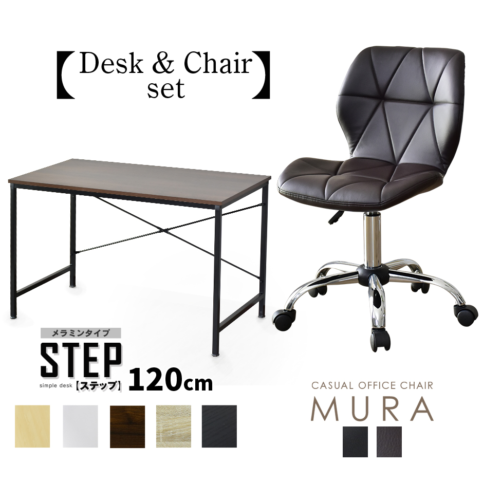 【配送につきまして】◆北海道・沖縄・離島は別途送料お見積りとなります。■商品名:ステップ メラミンタイプ120cm×60cm & ムーラ【Step 120 60 & Mura】■本体サイズ【ステップ メラミンタイプ120cm×60cm】約幅120×奥行60×高さ74(cm)【ムーラ】約幅47×奥行55×高さ77(77〜88.5)×座面高44(44〜55.5)(cm)■梱包サイズ【ステップ メラミンタイプ120cm×60cm】約幅123×奥行61.5×高さ9(cm)【ムーラ】約幅56×奥行36×高さ52(cm)■材質【ステップ メラミンタイプ120cm×60cm】合成樹脂化粧パーティクルボード(メラミン加工)【ムーラ】ポリウレタン・積層合板・金属・ウレタンフォーム■本体重量【ステップ メラミンタイプ120cm×60cm】約15.5kg【ムーラ】約7.5kg■耐荷重【ステップ メラミンタイプ120cm×60cm】約40kg【ムーラ】約90kg■総重量(梱包材含む)【ステップ メラミンタイプ120cm×60cm】約16.5kg【ムーラ】約9kg