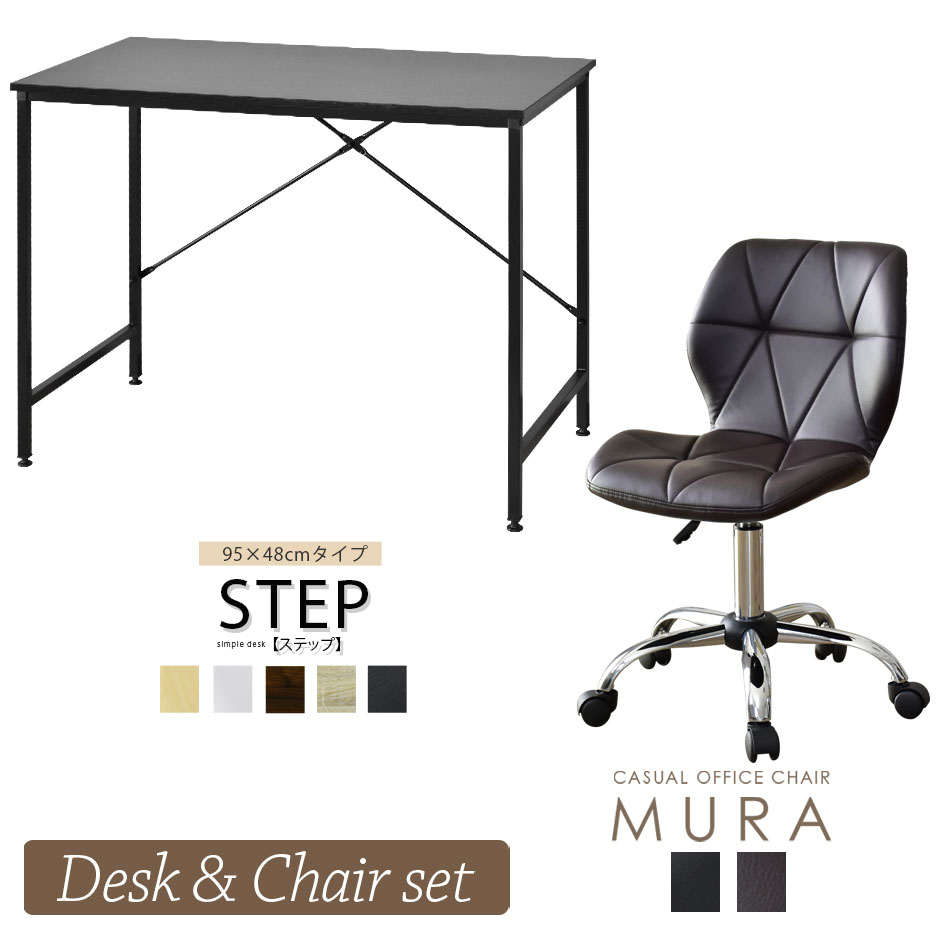 【配送につきまして】◆北海道・沖縄・離島は別途送料お見積りとなります。■商品名:ステップ95×48cm & ムーラ【Step95×48cm & Mura】■本体サイズ【ステップ95×48cm(デスク)】幅95×奥行48×高さ74(cm)【ムーラ(オフィスチェア)】幅47×奥行55×高さ77〜88.5(cm) 座面高44〜55.5(cm)※個体差により若干の差異あり■梱包サイズ【ステップ95×48cm(デスク)】約幅98×奥行50×高さ7(cm)【ムーラ(オフィスチェア)】約幅56×奥行36×高さ52(cm)■材質【ステップ95×48cm(デスク)】合成樹脂化粧パーティクルボード(メラミン加工)【ムーラ(オフィスチェア)】【PUレザー】ポリウレタン積層合板・脚:金属■本体重量【ステップ95×48cm(デスク)】約7.5kg【ムーラ(オフィスチェア)】約7.5kg■耐荷重【ステップ95×48cm(デスク)】40kg【ムーラ(オフィスチェア)】80kg■総重量(梱包材含む)【ステップ95×48cm(デスク)】約8.5kg【ムーラ(オフィスチェア)】約9kg