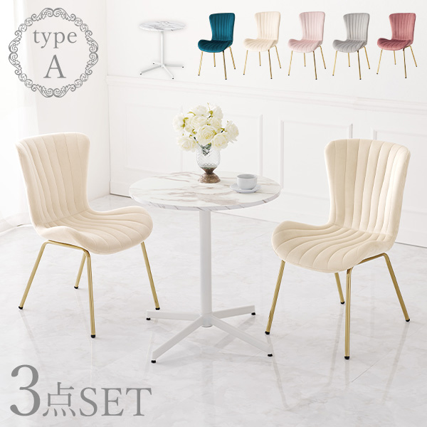 大理石調カフェテーブルとベロア調チェア2脚の3点セット。天板のサイズは直径65cm。狭いお部屋においても圧迫感がなく、一人暮らしにもちょうどいいサイズ感。食卓や作業机としても幅広く活躍します。貝殻をモチーフにしたシェル型の背もたれと座面がオシャレなデザインのダイニングチェア。カラーはライトグレー・ピンク・アイボリー・ディープピンク・ダークブルーの5色から選べます。■テーブル【商品サイズ(約)】幅65×奥行65×高さ70cm【梱包サイズ(約)】幅70×奥行70×高さ12.5cm/6.8kg【材質】天板:合成樹脂化粧繊維板(メラミン樹脂)フレーム:スチール(粉体塗装)【生産国】中国【備考】組立品(工具付属)■チェア【商品サイズ(約)】幅50×奥行58×高さ84【梱包サイズ(約)】幅66×奥行48×高さ51cm/8kg【材質】フレーム:積層材/スチール(メッキ)生地:ポリエステルクッション材:ウレタンフォーム【生産国】中国【備考】組立品(工具付属)