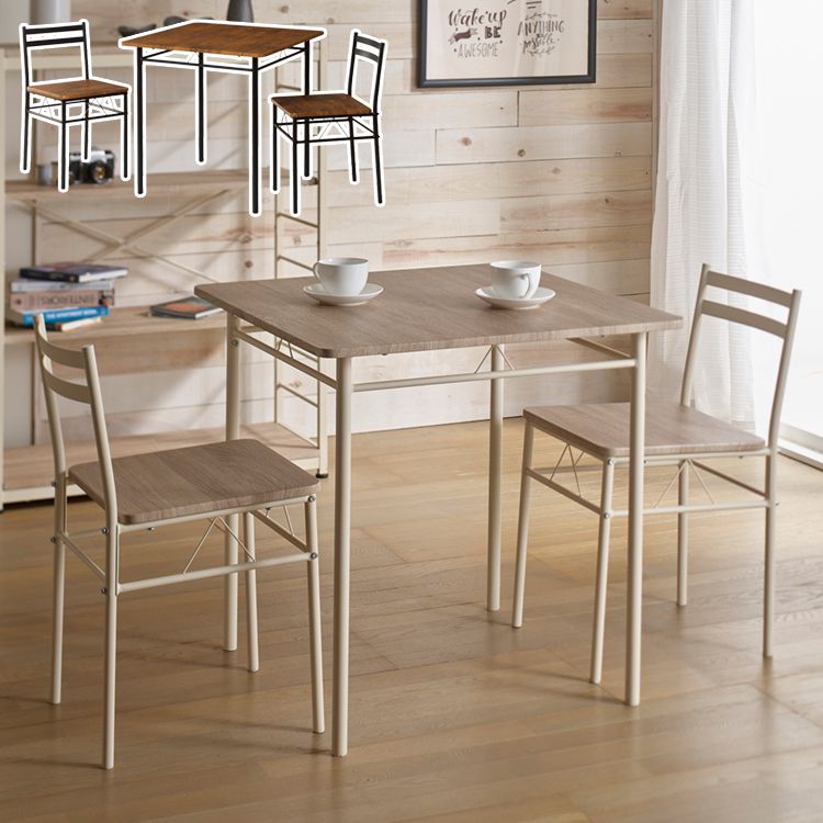 スチールフレームがシンプルで、どんなお部屋にも合う組立式ダイニング3点セット■セット内容 テーブル:1台、チェア:2脚■サイズ テーブル:W700×D700×H700mm チェア:W360×D460×H700(SH420)mm■材質 天板・座:MDF(15mm厚)・PVC貼り テーブルフレーム:スチール(Φ24.8mm)粉体塗装 チェアフレーム:スチール(Φ19.1mm)粉体塗装