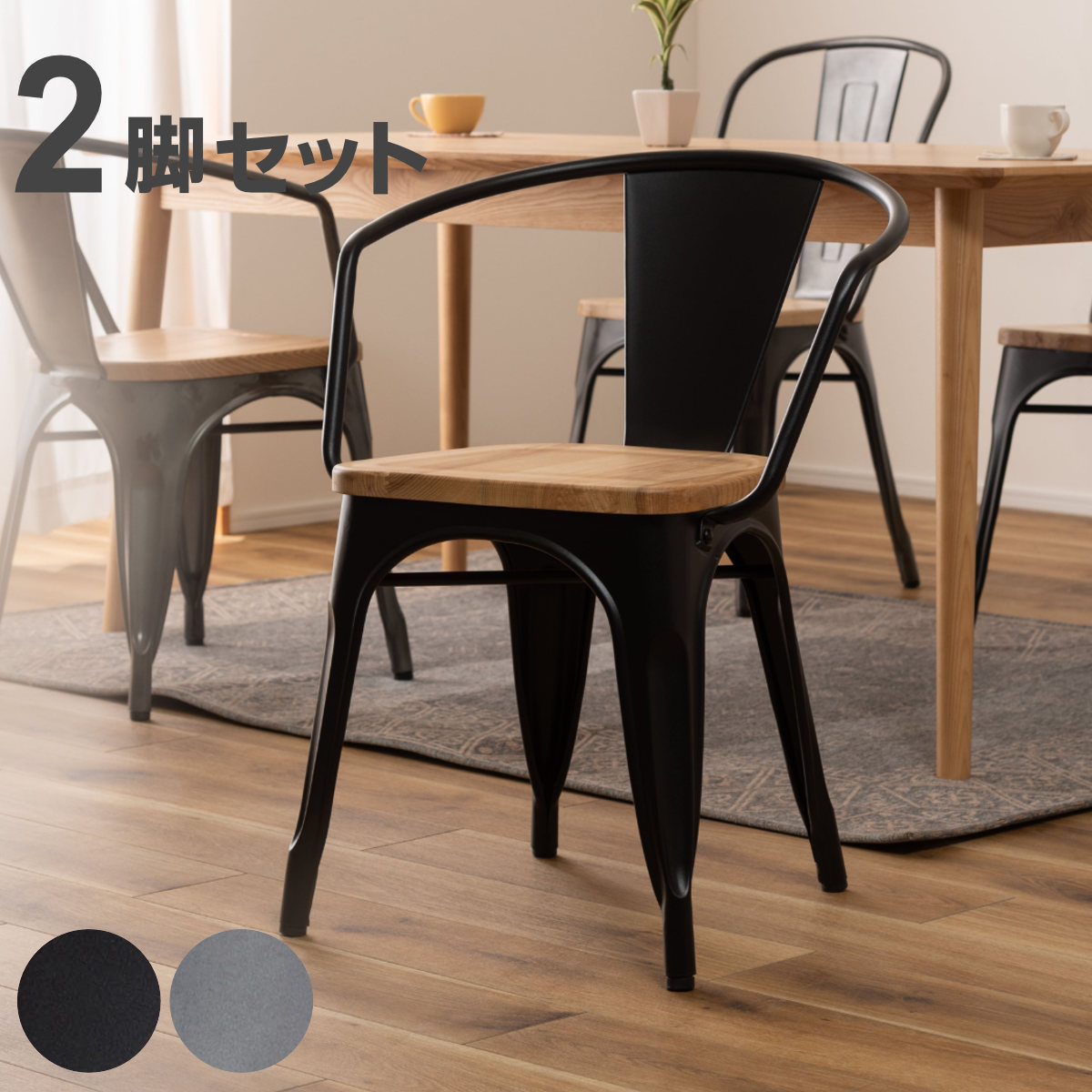 ■ダイニングチェア 座面高44.5cm 木製座面 肘付き 2脚セット ( 同色 セット 椅子 いす イス チェア スチール脚 完成品 ダイニング 背もた