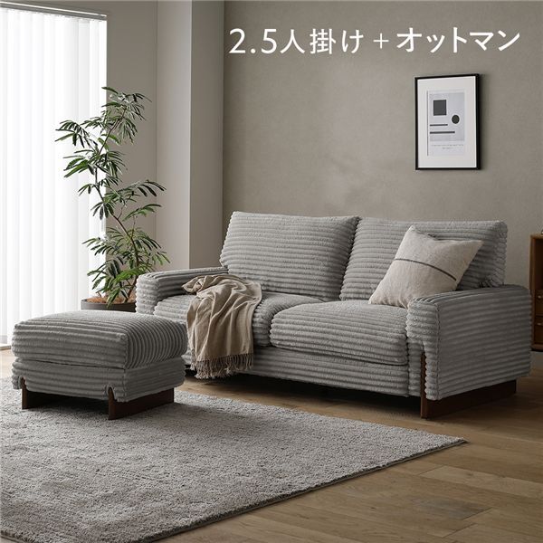 太畝コーデュロイ ソファ 2.5人掛け ソファー + オットマン セット グレー 天然木 木脚 肘付き 羽毛使用 リビング ダイニング