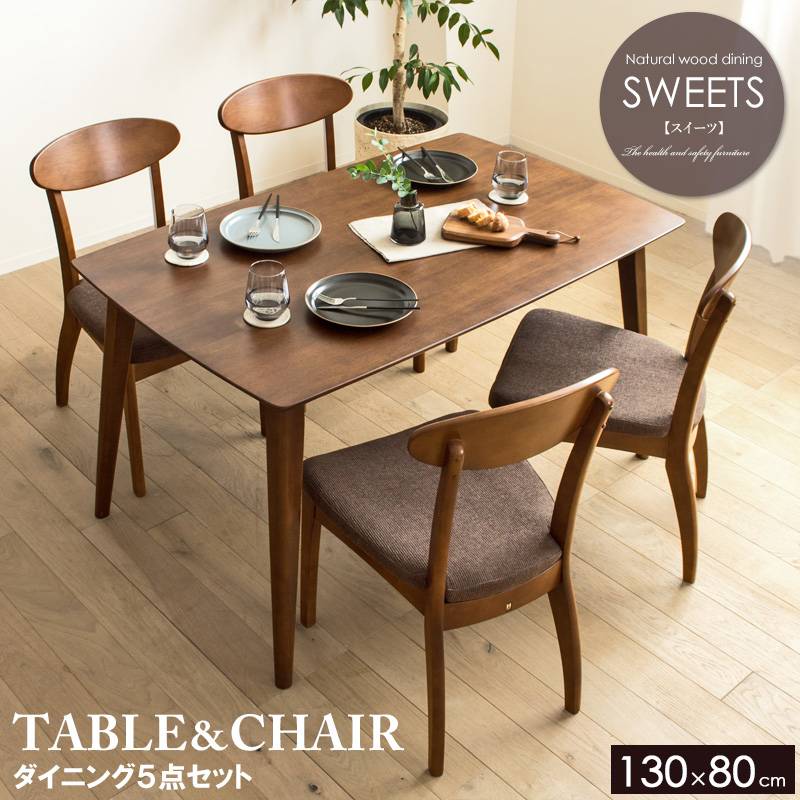 シンプルで馴染みやすいデザインと、細かい部分までこだわった仕上げの高品質なダイニングシリーズ「スイーツ」。 天然木ラバーウッドをふんだんに使用しておりますが、木目の綺麗な質の良い材料を用い、 角部分の面取り加工や表面をウレタン樹脂塗装で仕上げることで、人に優しいなめらかな手触りを実現。 さらに化学物質などに敏感な方や、 小さなお子様がいらっしゃるご家庭でも安心の低ホルムアルデヒド家具で、シックハウス対策に配慮しています。 ※こちらはダイニングテーブル5点セットの販売ページです。 天然木製品について 本製品には天然木を使用しているため、 木目や節の位置、木肌の色味などが一点ごとに異なります。 これらは天然木無垢材の特徴であり個性と考えておりますので、 予めご理解の上ご検討をお願いいたします。