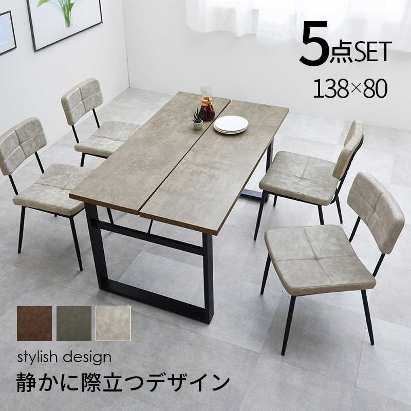 ダイニング5点セット LT-4771-50-5S コンクリート調のテーブルに座面と背もたれの大きなステッチがアクセントとなるチェアを合わせたダイニングセット。張地はヴィンテージ感のあるエイジング加工をした色合いです。 生産地 中国製 サイズ テーブル:(約)幅138×奥行80×高さ70cm、チェア:(約)幅45×奥行54×高さ78.5×座面高42cm 素材 天板:合成樹脂化粧繊維板(メラミン樹脂)、脚部:スチール、張地:合成皮革 ■組立式 ■アジャスター付