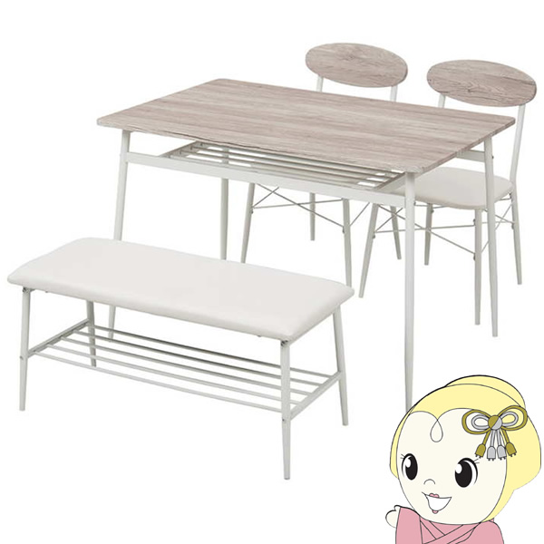 おしゃれカフェのようなダイニングセット。テーブルをスッキリ使える棚付き。幅105cmのコンパクトタイプ。 ■サイズ テーブル:(約)幅105×奥行70×高さ70cm チェアー:(約)幅45×奥行50×高さ76×座面高42cm ベンチ:(約)幅86×奥行38×高さ42cm ■素材 フレーム:スチール、天板:合成樹脂化粧繊維板、張地:合成皮革、クッション材:ウレタンフォーム ■内寸及び補足説明 組立式 ※写真はメーカー様のカタログ等から掲載させて頂いております。 実物の商品と写真の色が若干写真写り等により異なる場合がありますのでご注意くださいませ。 万が一の際でございましても返品はお受け致しかねます。 ※写真に写っている小物などは付属しておりません。 ※お客様組立て品につきましては、組み立て後に不良の連絡をされても対応ができません。 組み立て前にパーツに不良・傷等がないか、必ずご確認下さいます様よろしくお願い申し上げます。 ※記載は商品仕様の一部です。仕様説明不足等の理由での返品はできません。特に適合等は必ずご確認ください。