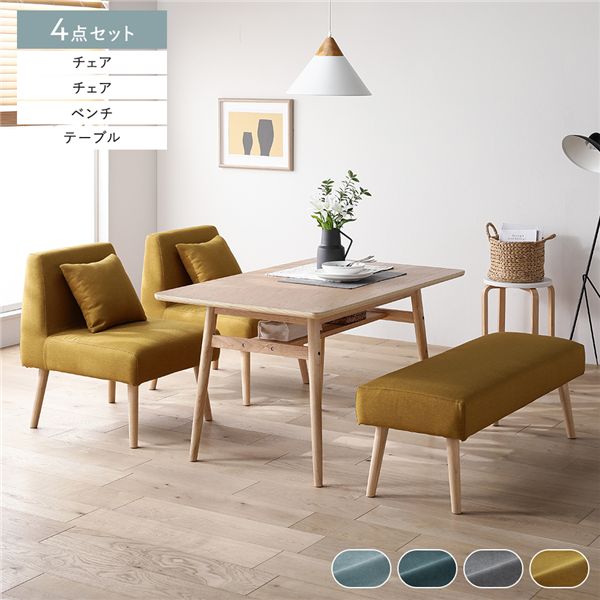 北欧ソファダイニング 4点セット テーブル 幅120cm + チェア 2脚 + ベンチ イエロー リビング ダイニング ソファ 組立品