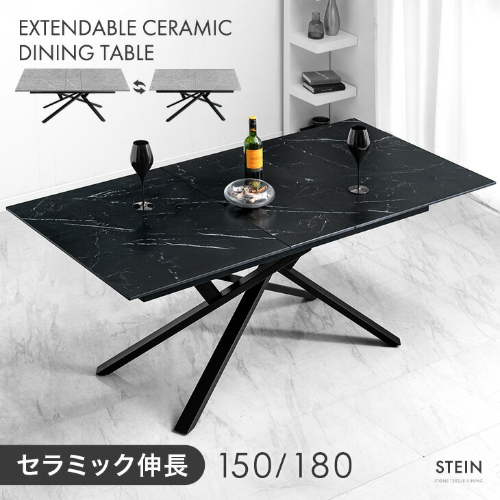 伸長式ダイニングテーブル セラミックテーブル 150cm 180cm 折りたたみ 折り畳み エクステンションテーブル 伸縮テーブル テーブル 黒 ブラック グレー おしゃれ 北欧 モダン 4人掛 4人用 6人掛 6人用 黒脚【商品番号:84400011】