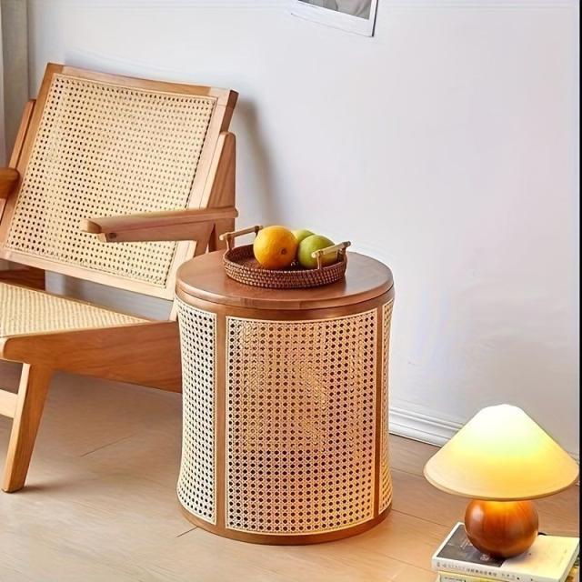 ■コーヒーテーブル ミニテーブル ベッドサイド サイドテーブル ラタン 無垢材 収納 机 ディスプレイ 円形 ナチュラル 北欧 シンプル かわ