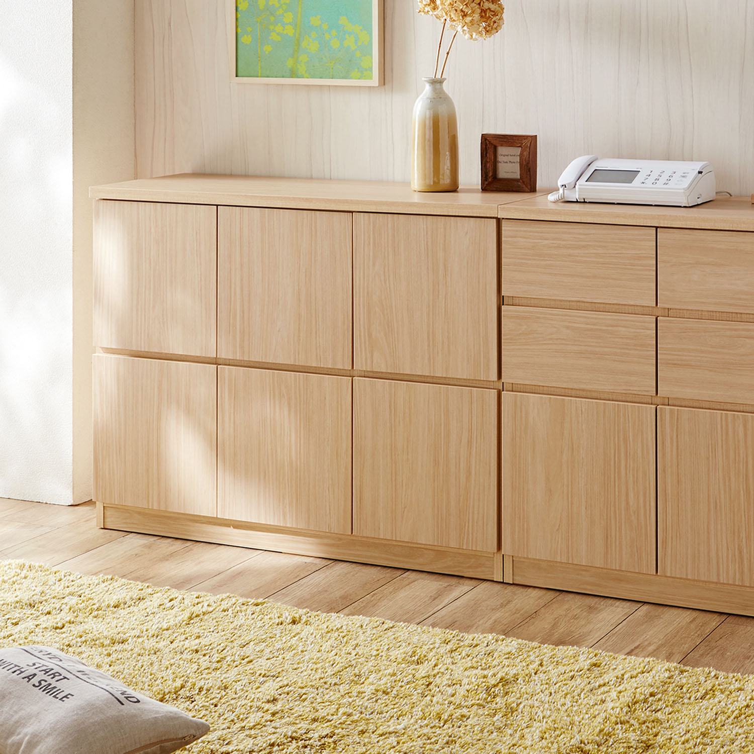 ハイタイプのテレビ台としても活用できる今時のマンションに使われている床材や壁紙にも馴染む、やや白味がかった木目調シートで仕上げました扉はすべてプッシュ式になっているので両手が塞がっていても開け閉めしやすいのが◎取っ手を省いたすっきりとしたデザイン出っ張りが無く、お子様がいるご家庭でも安心下段にはコード穴を設け、ルーターなどの収納にOK仕分け収納に便利なつくりは2サイズから選べます