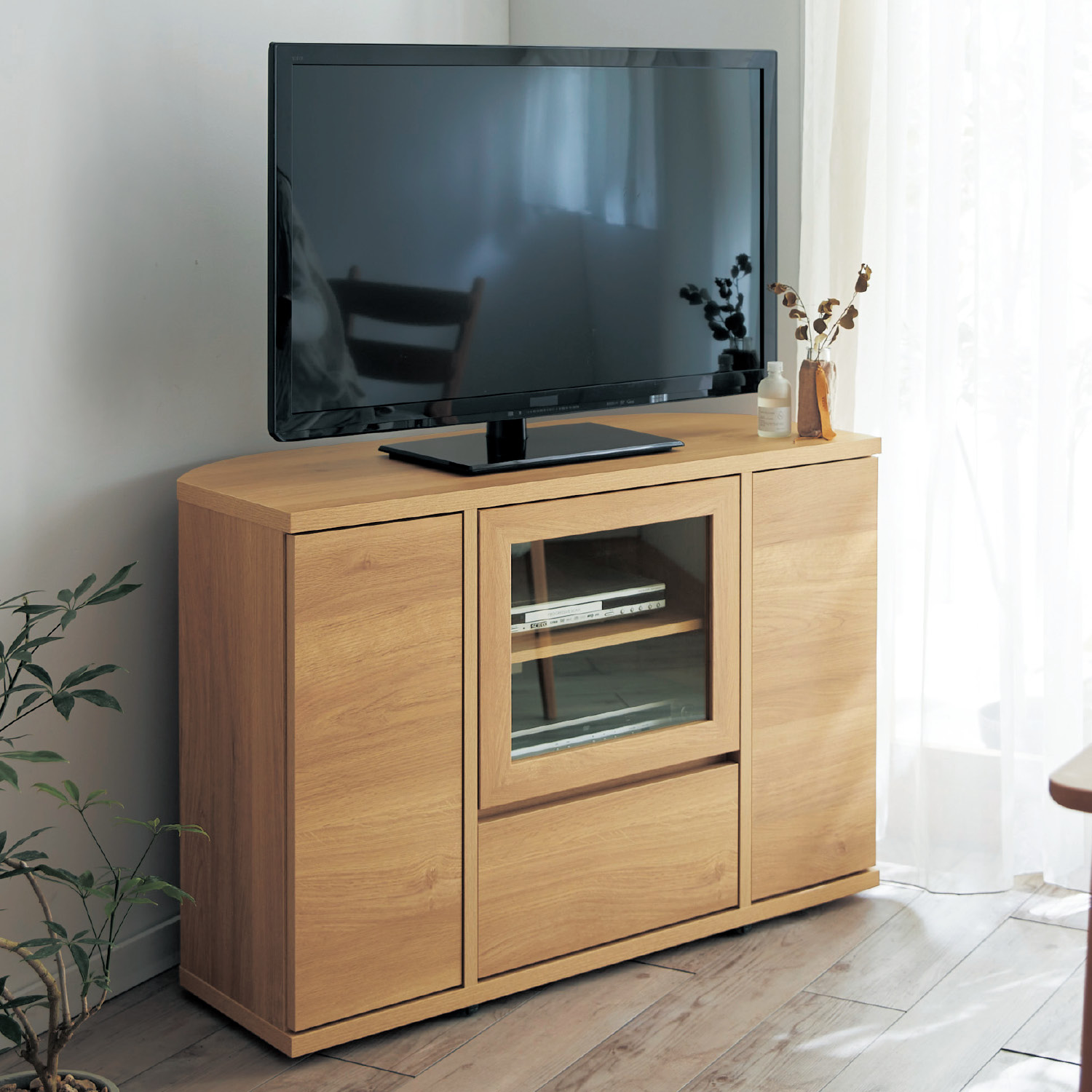 どんな角にも収まる背面のデザインちょうどいい角度に設置可能隠しキャスターで移動がスムーズでお掃除もラクラクフラップ扉を開ければデッキを収納可能両サイドの扉には可動棚付き。ルーターや説明書などの書類の収納にコード穴や背面のコード巻きなど、配線しやすい仕様#コーナーテレビ台