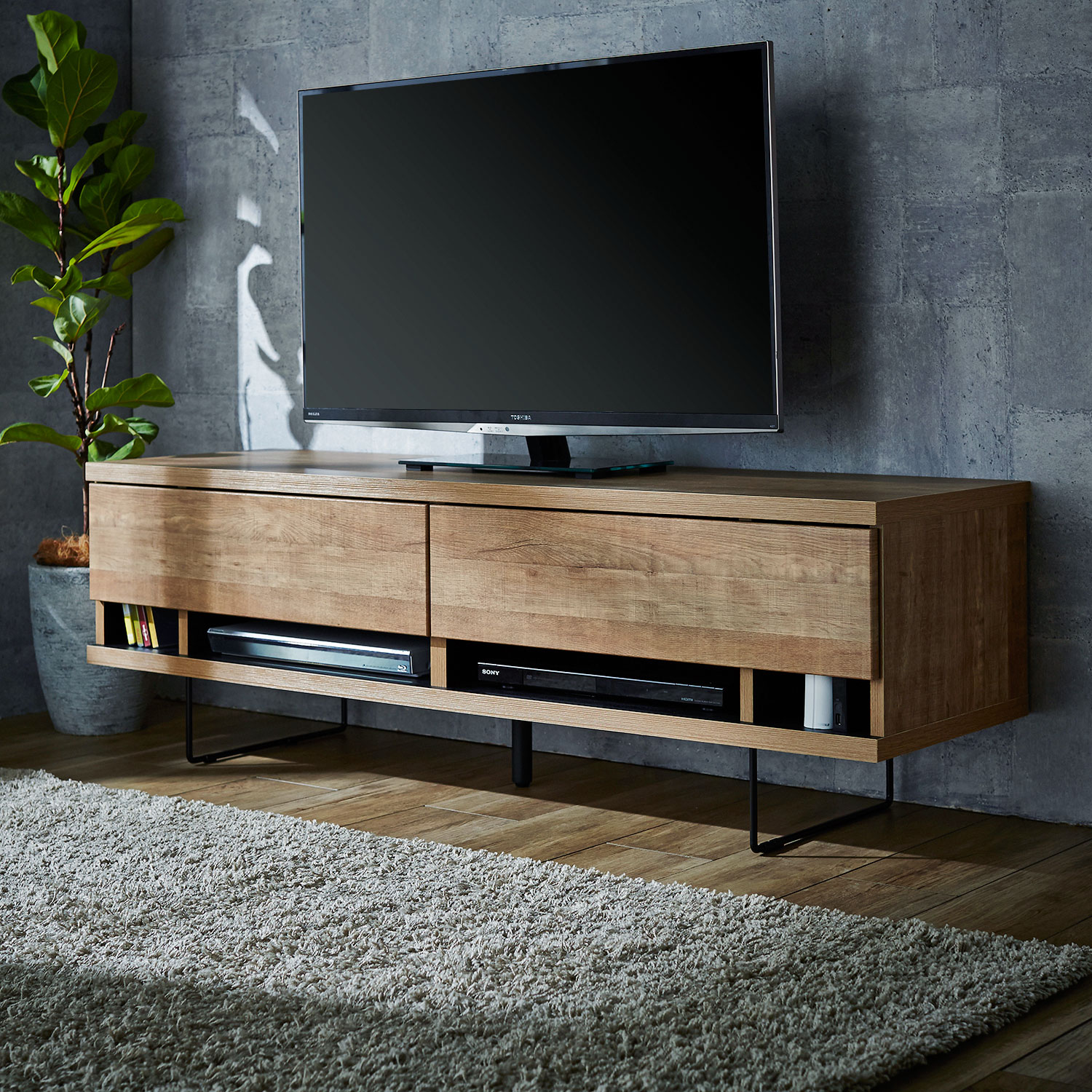 使いやすさを追求したシンプルモダンなテレビ台サイドと下部にはオープンスペースを備え、AV機器やルーター類を収納可能上段に備えた引出しにはDVDやCD、取扱説明書などを収納OK引出しが上部にあるので低くしゃがまなくても物を取り出しやすいつくり背面にはコンセントとタップ収納部付き背板がないのでコード配線しやすいのも使い勝手のいいポイントです前から見た時もすっきりとした印象になるので、インテリアを損ねないのも魅力スタイリッシュな足元はお掃除ロボOK