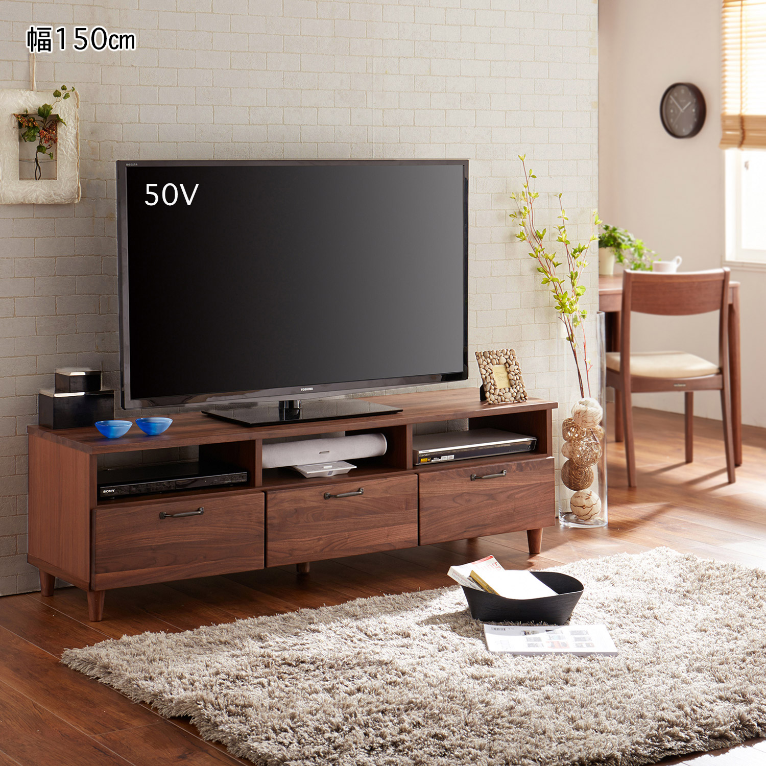 天板と引出しの前板に、表情豊かな天然木のウォルナット材を使用先細りの丸脚とアイアン素材のハンドルがシックでモダンな印象です上部のオープン棚は背板がないので、DVDデッキや新聞、雑誌などを収納しても内側は清潔感あふれるホワイトに仕上げた深めの引出しは奥までスーッと引き出せるフルスライドレール式引出しが2つの「幅約120cm」と引出しが3つの「幅約150cm」、お部屋のスペースに合わせて2サイズから選べます