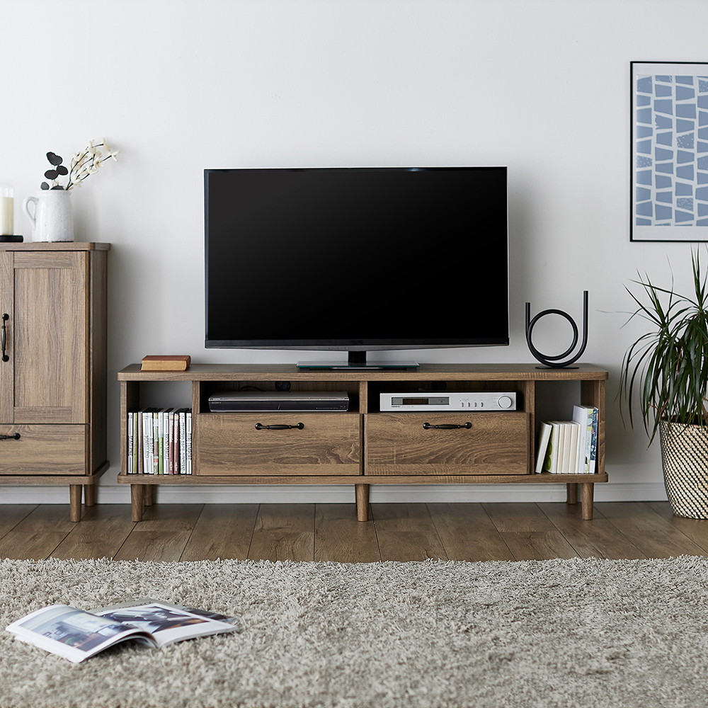 ナチュラルな空間に馴染むテレビ台シリーズシンプルながらもトレンド感のあるシートを使用しているので、空間とうまく調和しつつ存在感を演出してくれます3サイズのテレビ台と1サイズのサイドキャビネットの展開テレビ台は、デッキ収納と引出し2杯の収納付きサイドキャビネットはベッド横に置いてナイトテーブルとしてのご使用もおすすめです
