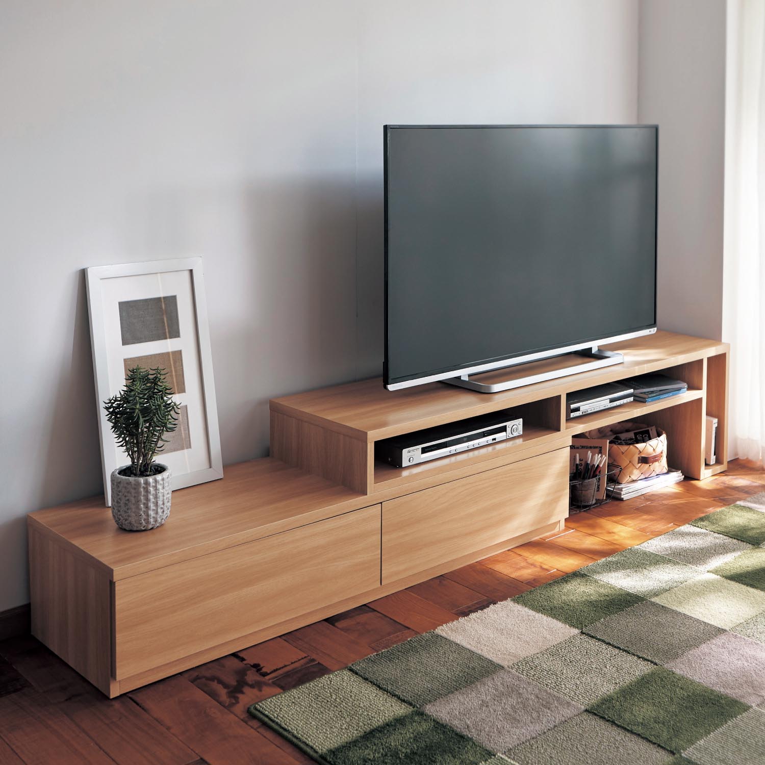 上部をスライドさせて幅と収納スペースを自在に調節できるテレビ台上部の前後を変えると左右どちらにもレイアウト可能お部屋のレイアウトに合わせて、形を変えられます。コーナーにL字型に設置もOKロータイプなので圧迫感がなく、リビングにすっきりなじむデザインですノートパソコンとプリンターを置いてワークスペースにしてもオープン部にはDVDデッキや雑誌などを収納することもフルスライドレール付きの引出し2杯付き引出しはDVDが立てて収納でき、背表紙が見やすい