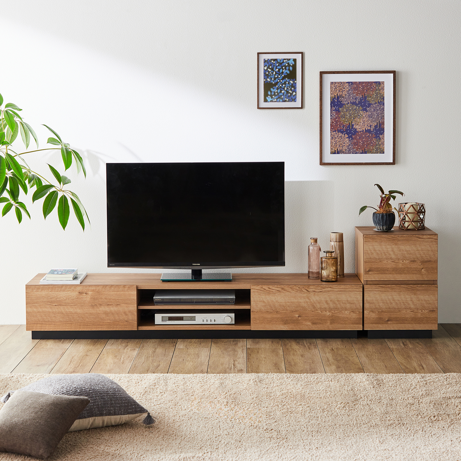 ナチュラルな空間に馴染むテレビ台シリーズシンプルながらもトレンド感のあるシートを使用しているので、空間とうまく調和しつつ存在感を演出してくれます3サイズのテレビ台と1サイズのサイドキャビネットの展開テレビ台は、デッキ収納と引出し2杯の収納付きサイドキャビネットはベッド横に置いてナイトテーブルとしてのご使用もおすすめです