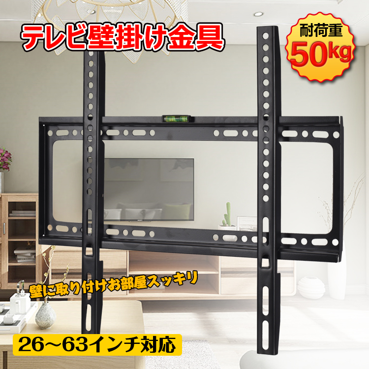 ■壁に設置することで、お部屋が広くスッキリに!■テレビ台なしでスペース広々!■26〜63インチ対応!スペースを取らない壁掛け金具■リビングや寝室、店舗での設備等、様々な場所で大活躍!【商品内容】:テレビ壁掛け金具 26〜63インチ対応【サイズ】:(約)46x42.5cm【重量】:約600g【耐荷重】:約50kg【カラー】:ブラック