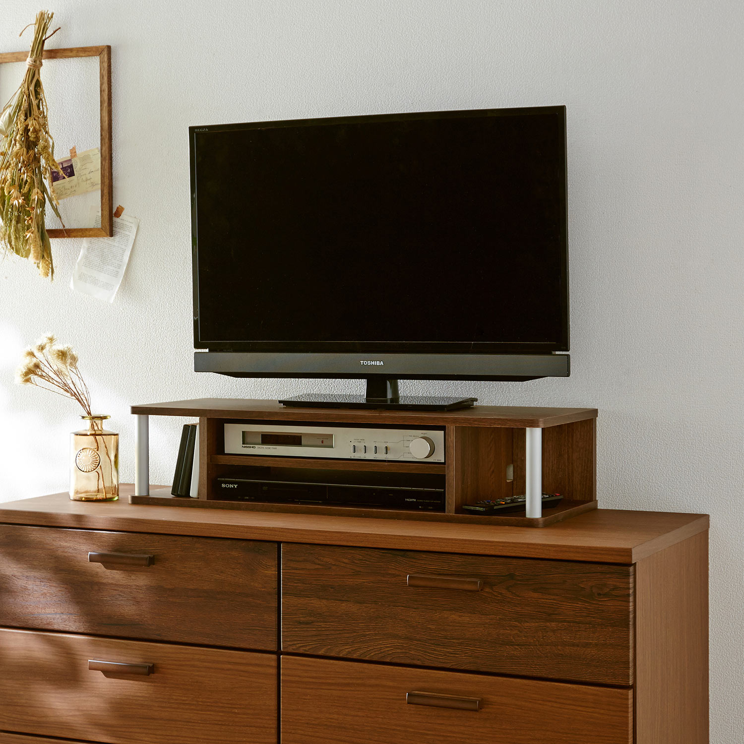 木目の表情が味わい深いチーク材の突板を使用表面にはオイル仕上げをほどこし、ナチュラルな風合いを生かしつつ、レトロ調の落ち着いた色味に仕上げました中の収納物を見せず、生活感を抑えるインテリア性の高さが魅力サイドがデッキ収納部になっていて、内部には取り外しできる棚板が付属しています浅めと深め、2杯の引出しには取扱説明書やソフト類などをしまえます天板の両端には転び止めをほどこしているから、テレビ横に雑貨やグリーンなどを飾っても転がり落ちにくく安心全体を安定よく支える4本の丸脚は、底面の内側に配置しているので足元がスッキリ見え、お掃除ロボットの動きもジャマしませんシリーズで揃えれば、統一感のある上品な空間に