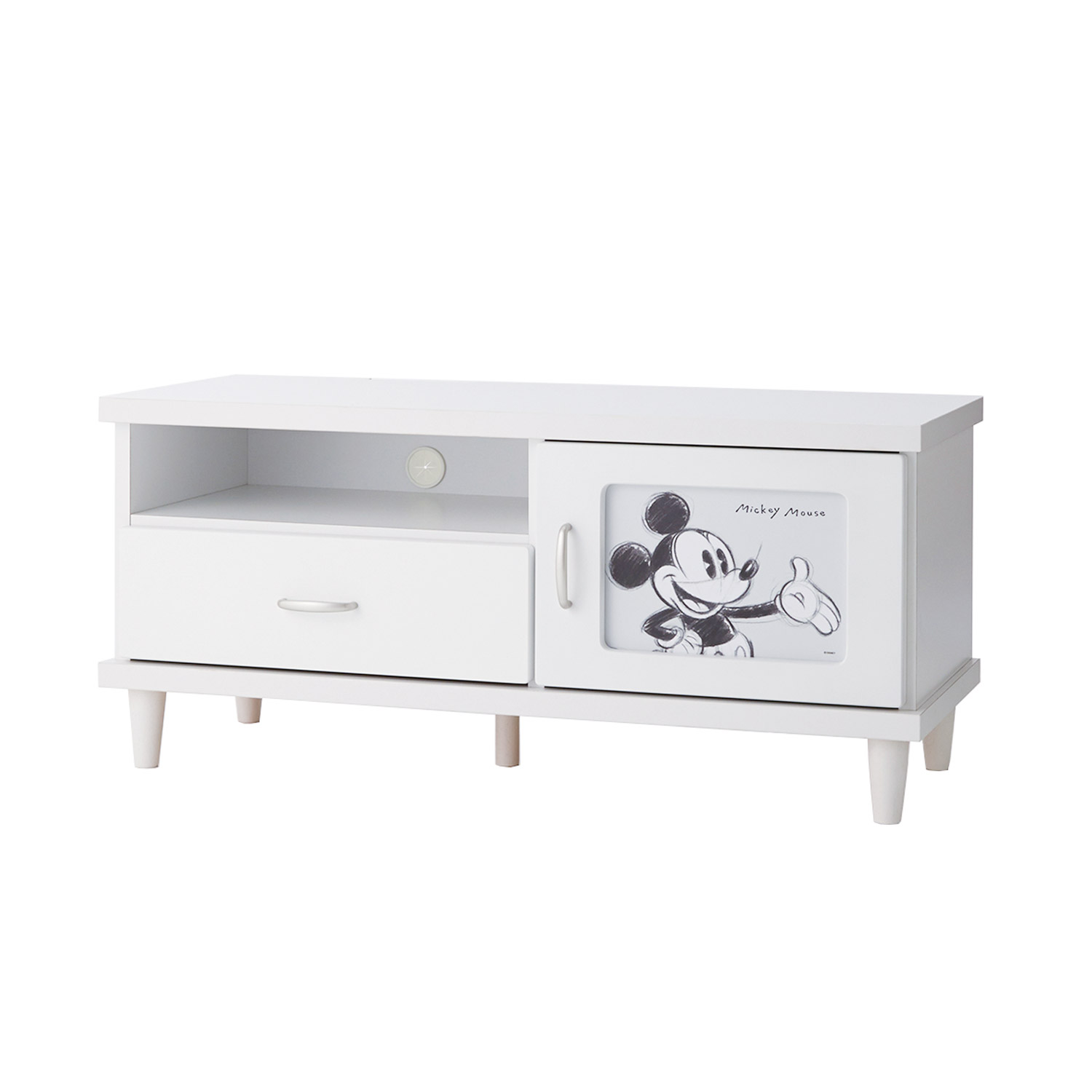 デッキ収納部、引出し、扉収納が付いた、シンプルながらも必要な仕様を備えたつくりで使い勝手は抜群。一人暮らしやプライベートなお部屋に置きやすい、コンパクトサイズのテレビ台。空間を明るくおしゃれに見せてくれる、ホワイトカラーで仕上げたデザイン表裏でデザインの異なるディズニー柄のパネルを付属しており、気分に合わせて扉の前板をコーディネートOK表面はモノトーンの優しいタッチのデザイン、裏面は、淡い色の波模様とミッキーモチーフ柄【ご褒美ディズニーグッズ】いつも頑張っている自分や家族へのご褒美に