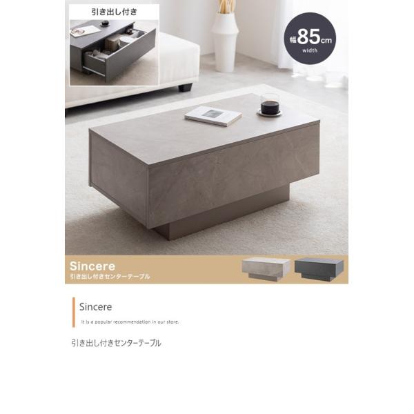 ストーン柄のニュアンスが上質な空間を作る『Sincere(シンシア)』引き出し付きセンターテーブル。無駄を省いたノイズレスなフォルムと、ストーン柄の組み合わせが美しいデザイン。お部屋に置くだけでアクセントとなり、洗練された空間へと導きます。また、大容量収納が可能な引き出しや隠しキャスターにより使い勝手も抜群。ロー設計のためソファに座っているときも、床に座っているときでも快適にお使いいただけます。配達業者を指定いただくことはできません。沖縄・離島に関しましては、別途配送料が必要となります。北海道への配送も別途配送料が必要になる場合がございます。※別途送料が発生する場合は後ほどご連絡させていただきます。タイミングによっては在庫切れの場合があります。