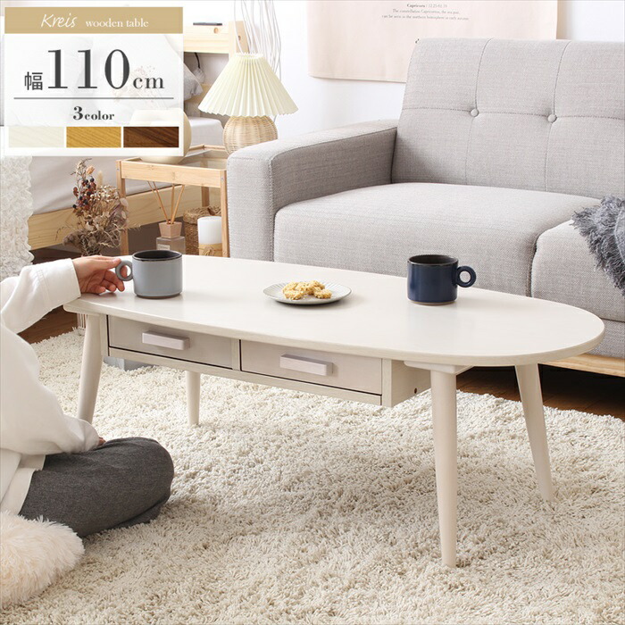小物を収納できる引き出し付きでお部屋スッキリ♪まあるいカタチが可愛い、木製ローテーブル。丸くて可愛い卵型の楕円形フォルムに、ぬくもりのある木の質感が空間を優しく包み込む、引き出し付きローテーブル・クライス。全体的に丸みを帯びた優しいデザインは、北欧風のナチュラルな雰囲気を演出。安全面も配慮しており、小さなお子様のいらっしゃるご家庭でも安心です。天板下には小物が整理収納できる引き出し付きで、使い勝手も良いデザインに仕上げました。引き出しは前後どちらからでもお使いいただけるので、頻繁に出し入れする物は手前に、普段あまり使わない物は奥に入れるといった使い方もできて便利です。こちらは存在感のある幅110cmタイプで、2〜3人掛けソファとの相性抜群。1人暮らしはもちろん、家族で集まるリビングにもぴったりのサイズ感です。カラーはシックで落ち着きのあるブラウン、温かみを感じるナチュラルに、フェミニンな印象のホワイトを加えた3色展開。お部屋の雰囲気に合わせて選べるカラー展開で、コーディネイトの幅が広がります。