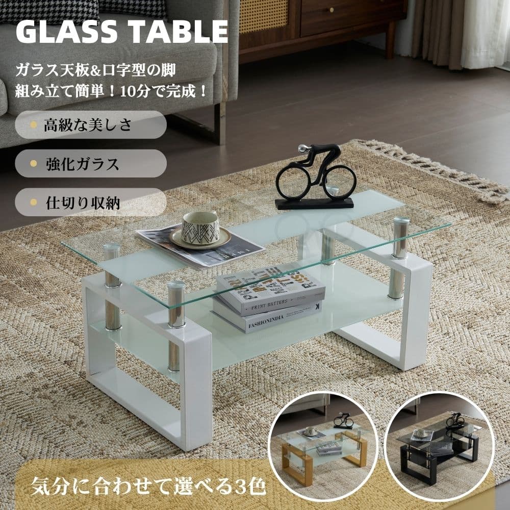 ■【数量限定x送料無料x10%還元】NARUMIガラステーブル ローテーブル 幅87.5×奥47.5×高39.5cm 強化ガラス天板 二段収納 口字型スチー