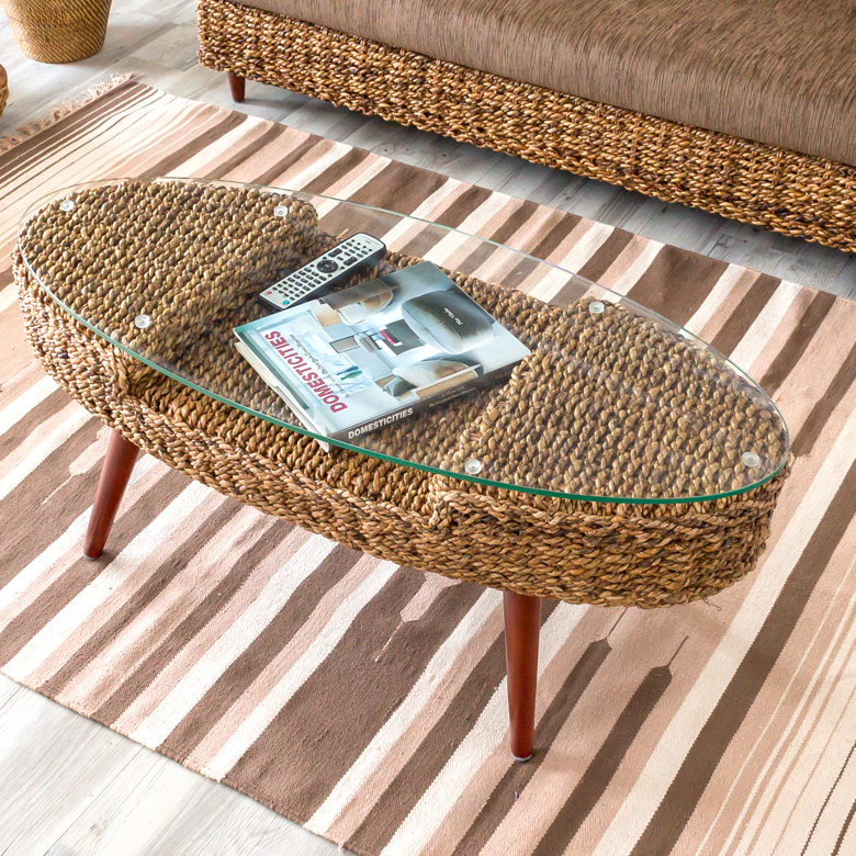 ■ラタンテーブル 楕円形 ガラス天板 ローテーブル 籐家具 幅80cm( センターテーブル アジアン )